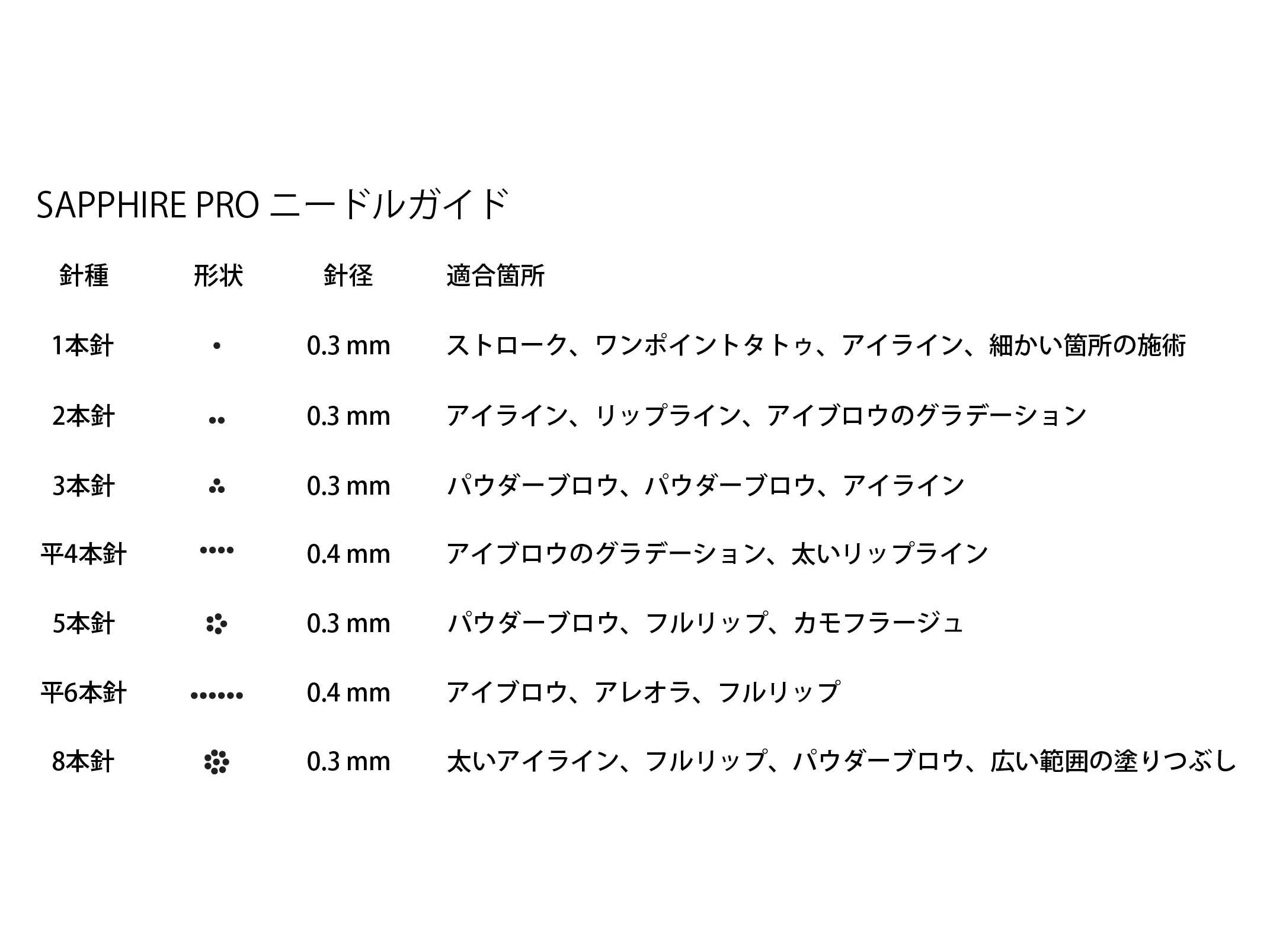 メイチャ Sapphire(サファイア)ニードル 3本針(50P) (MC-8883) 販売価格¥18,000在庫状態 : 在庫有りMEI-CHA(メイチャ)のタトゥー・アートメイクマシンSapphireシリーズ用のニードルチューブ一体型3E コンボニードルです。 特許取得済みの このニードルは、マシンの内部パーツが血液、体液、色素などに汚染されることを防止します。 Sapphire PROとDynasty 2000-Sapphireの両機種に適合します。 50個入 ※写真はイメージです。パッケージやデザイン・色等は写真と異なる場合があります。 数量